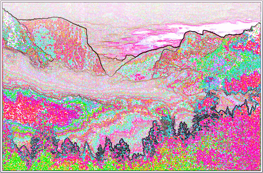 Barrie, I agree with Brian that something is needed, but I don't think a bird would do it for me. I see this image as an impression of shapes and colors. To my eye a moderate change in perspective, would help. I applied a curves adjustment to the center portion, a slight increase in saturation of the foreground, and added a haze to the background. |
