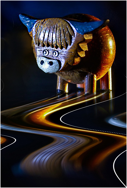 In my VF I tried to lean up the excess lighting, And while I was playing, The cow's reflection looked a bit static to me, so I masked off the top, and applied the shear filter. The look I got is totally different We now have curved leading lines to the subject, which adds a feeling of motion to the image.