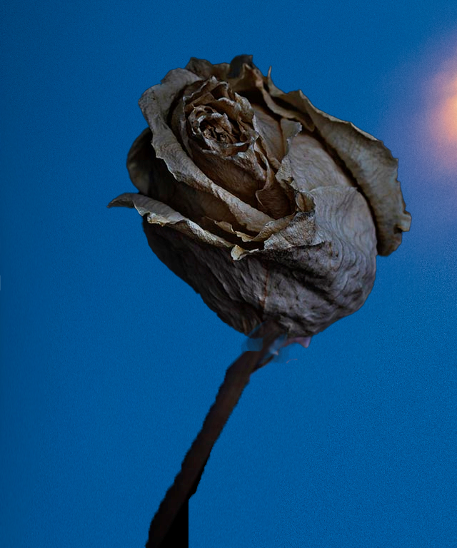 I am not certain that I agree with the use of the dark background. I understand what the mood image creates, but that is not to my taste, even though I have never knowingly eaten a dried rose. In my VF the light source is an edge of the moon. There are streaks of blue and orange in the rose, which compliment the blue from the sky, and a reflection of moonlight. I guess that's why Ford no longer makes cars only in black. |