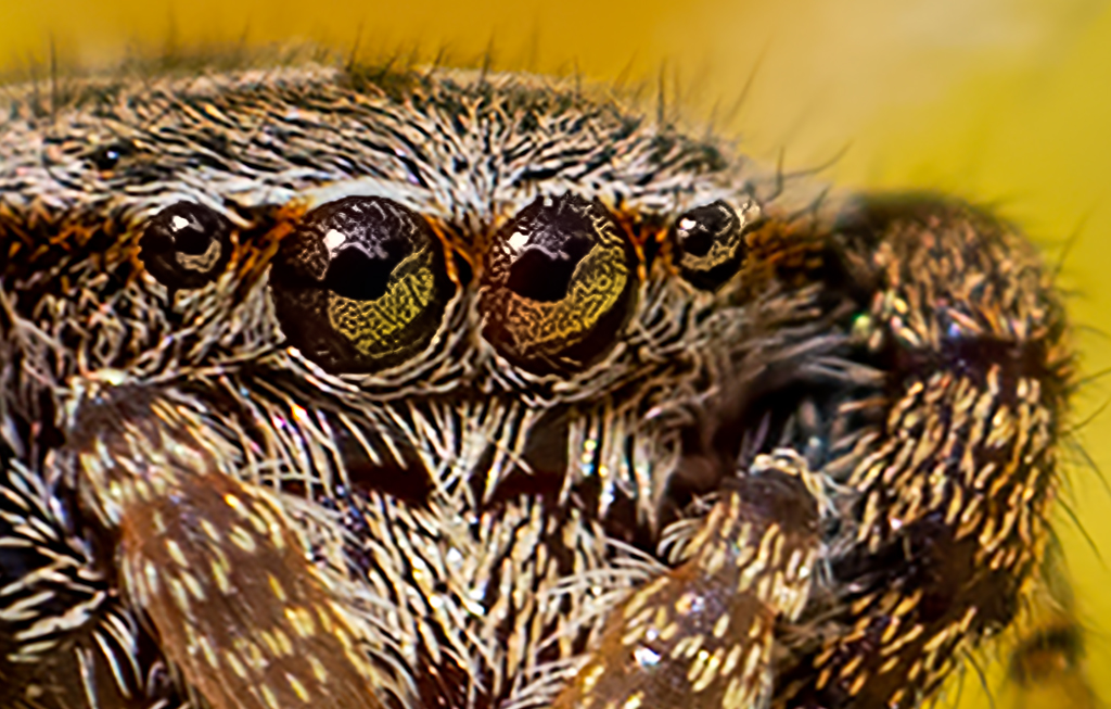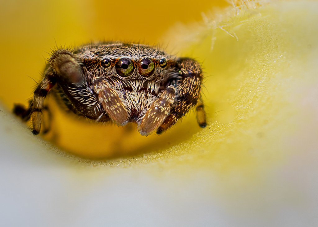 I will start by saying that I agree with Charles that you have a fun shot, and almost everything else that he said. But you need to decide whether you are shooting a spider on a flower, or a flower with a spider on it. If you wanted the latter, his advice is perfect. However, since you only took one shot, and the spider is fairly sharp, with the flower blurry, you might want to try enlarging with Topaz Gigapixel, and cropping down. In this case I made a 4x enlargement, about a 3.5 high pass sharpening, and brightened up the eyes in ACR, which is the same as Lightroom. I did not make any other adjustments, except for a crop and resize down. |