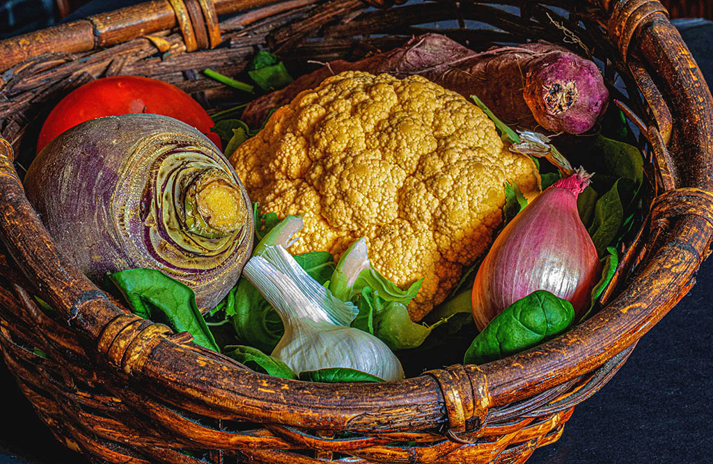 Hi Sandra, That basket of veggies makes me hungry. I like the composition and theme of your image. This is only a matter of taste. (no pun intended.) My eyes keep being drawn to the cauliflower, so I cut back on the highlights, lightened the shadows, and played separately with the the red & green saturation and lightness, to give you an idea of what I mean. |