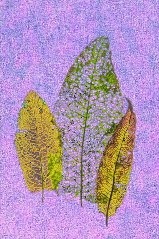 Hazel, Welcome to the group. I really like the concept of your image. I see it as a Wabi-Sabi. I agree with Joan about the white background. To give you an idea of some possibilities, I played in PS and substituted one of my home-made backgrounds, (An extreme crop of a sky at sunrise, enlarged about 15 times to get grainy pixels.) I then made some selective adjustments to the leaves. |