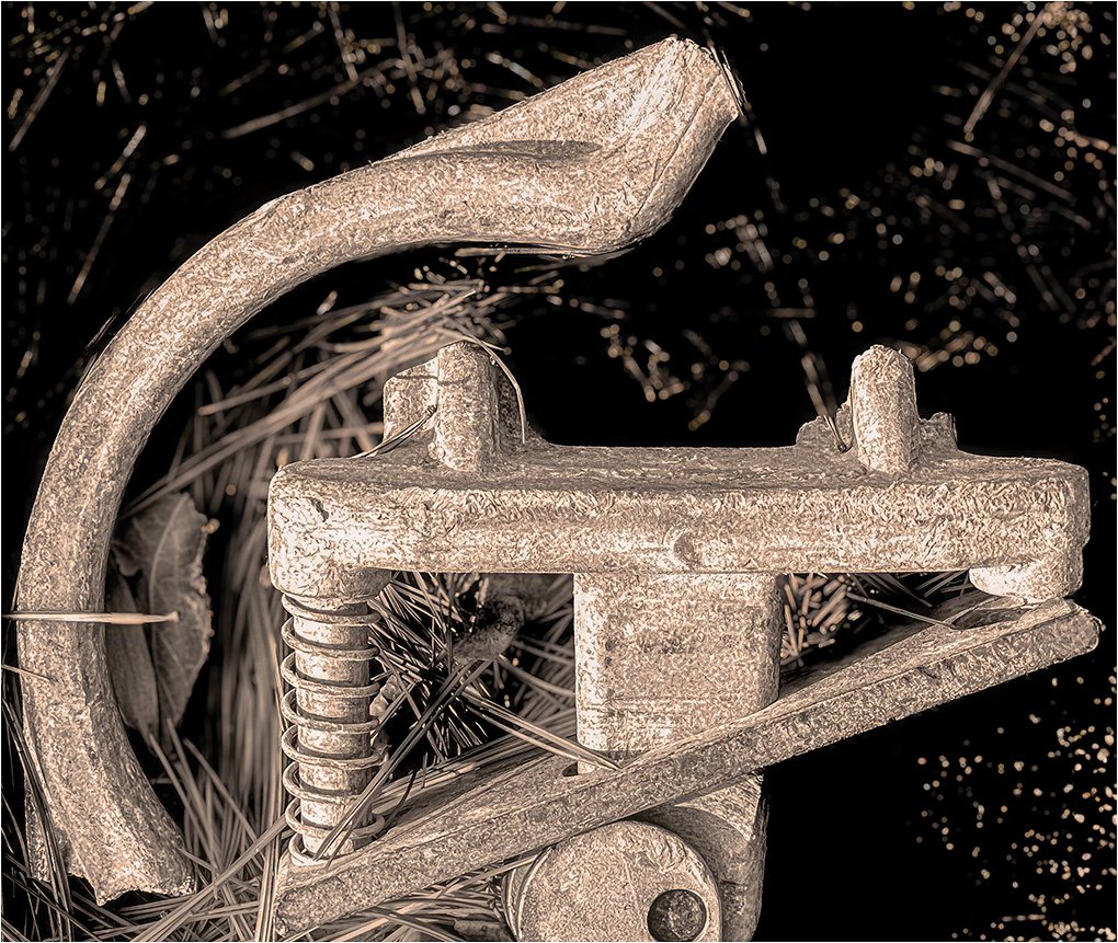 The subject is the tool. To my eyes I see very little relationship between the straw and the tool, so I prefer the version without a lot of straw. In ACR I tried the new blur tool to get more separation yet leave in some straw to keep your abandonment concept. An orange photo filter combined with contrast reduction gives a bit more age to the tool. A bit more background was added to give the tool more breathing space on the right. I join those who don't know what the tool is but, under threat of pulling out my fingernails, I would say it's a hand powered press. |