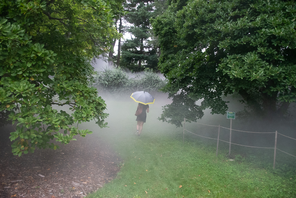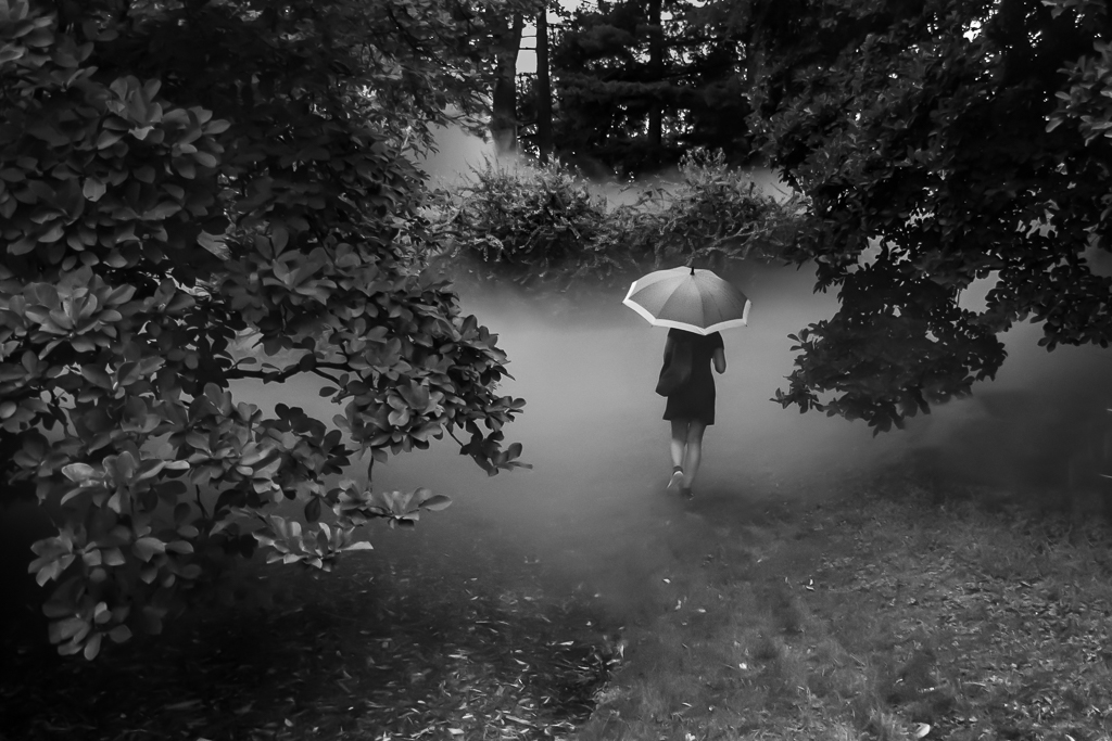 So, I like the idea of making my Lady with the Umbrella smaller relative to the nature around her, but the fence is too much to clone out and it is unacceptable to me in the image which is why I concentrated on the left side of the image. I also wanted to get rid of the bright light between the trees in the top center and to keep the attention on the fog which is most predominant below that bright spot. I could back off a little more. After your comment, Stephen the woman truly seems too big. |