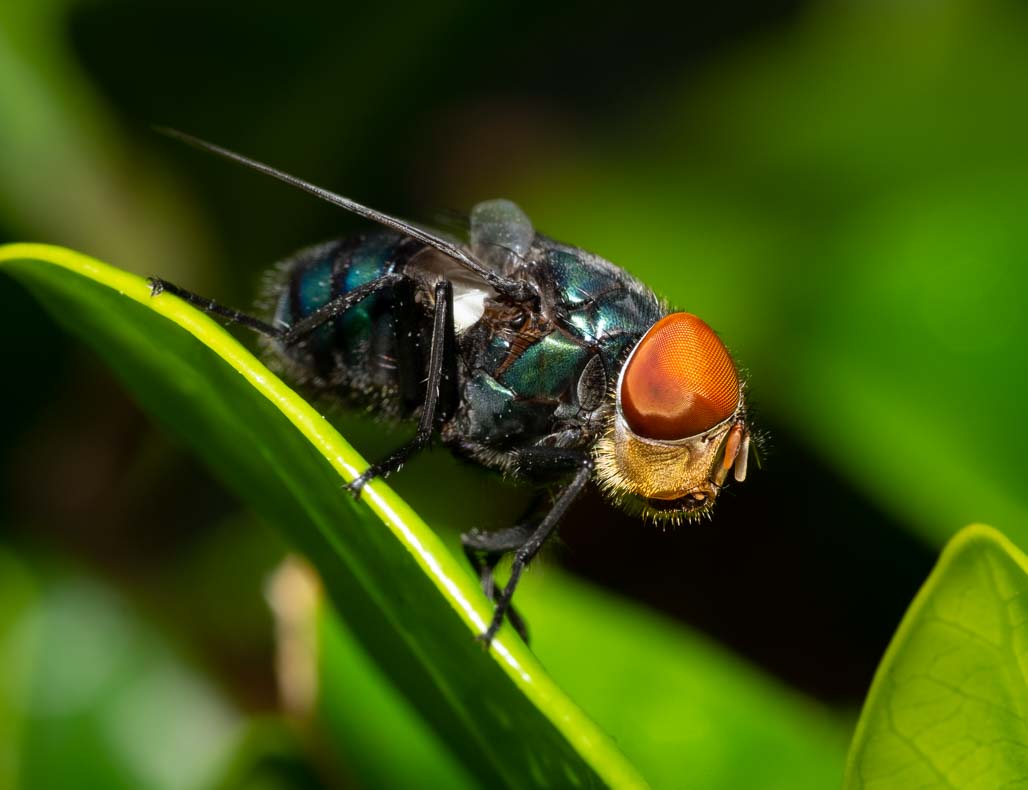 Wow - wonderful capture Will. As Bill says - the eyes have it. I like that the background is unobtrusive and blurred. The detail you captured on the edge of the wing is beautiful. You used the available light to your advantage, I find that it has created some strong shadows and that, for me, adds to the impact of the image. I like the colours in the image - the red in the eyes, the touch of blue in the body and the highlight of yellow in the leaf - all strong primary colours on the background of green - very striking. cheers Nadia |