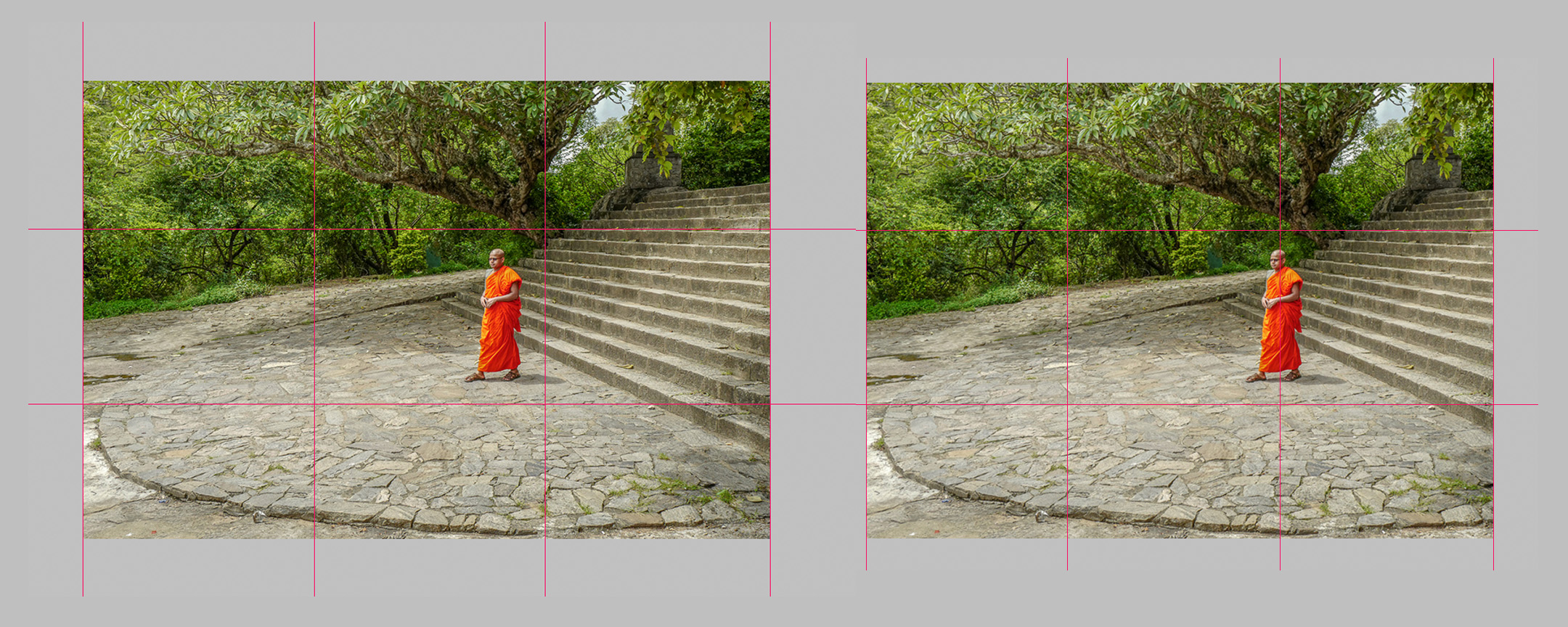 Cropping from the left will position the monk on 2/3 ratio, may be a good idea or may not. I am not sure, Attached side by side comparison, one as it is and the other with a little crop as suggested, both looks good to me.