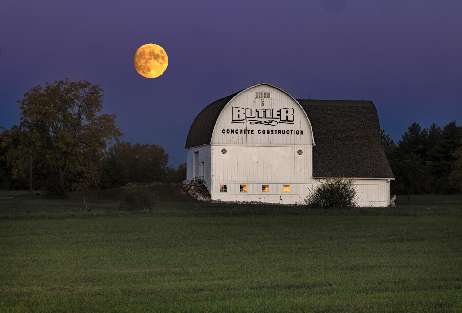 Slightly small moon and at the height where it creates some distance to the front structure. I also would brighten grass little more as it's a full moon night.