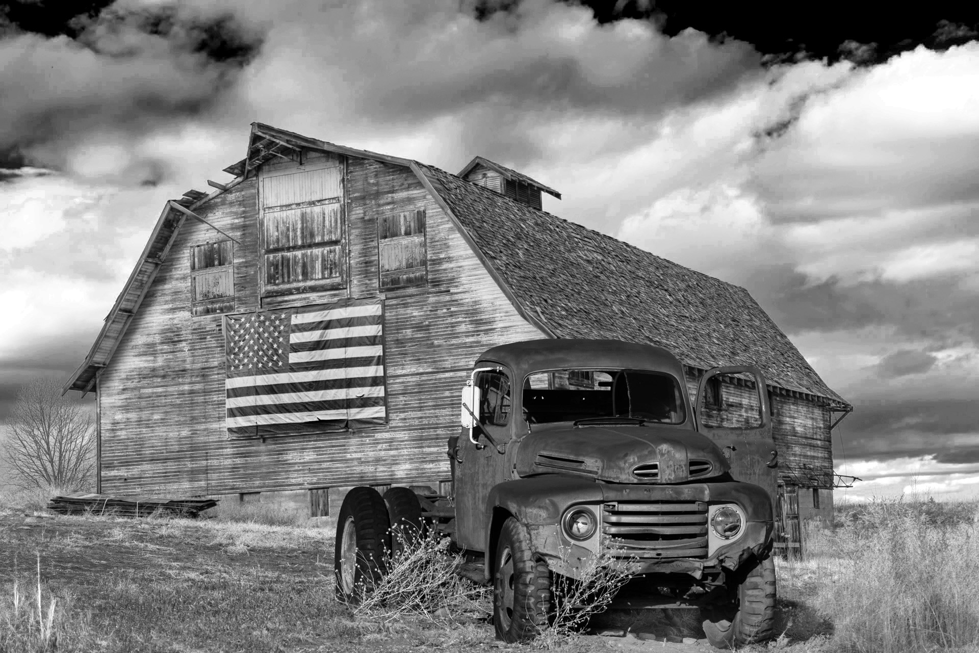 The black-and-white conversion is handled well; the processing looks solid and nothing feels overdone. If I were to suggest one minor adjustment, I might treat the truck, the barn and dry grass on slightly different tonal scales-just a subtle adjustment in brightness and contrast on the burn-to help truck pop a bit more against the background. I've attached a quick edit to illustrate this idea.