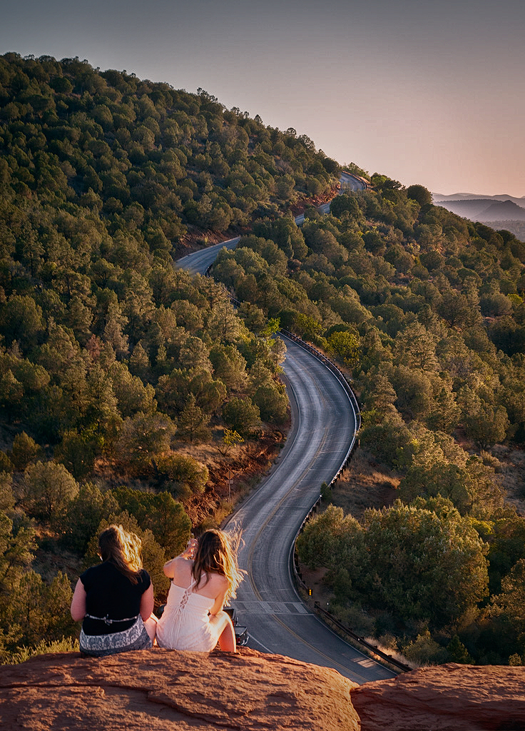 I would darken the rock a little bit so that the focus will be on the girls. I would lighten the road a little bit as well so that the shape of the road will pop out.