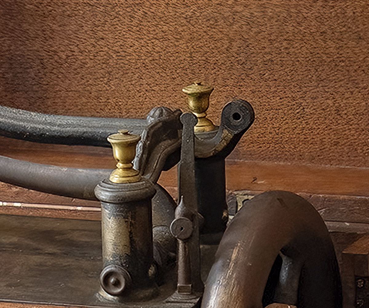 Wow, what a unique machine. Never seen one like it. Guess it's a hand-crank? Would have liked to see a closer look at some of the details. The contrast between the wood and metal would be a good study. |