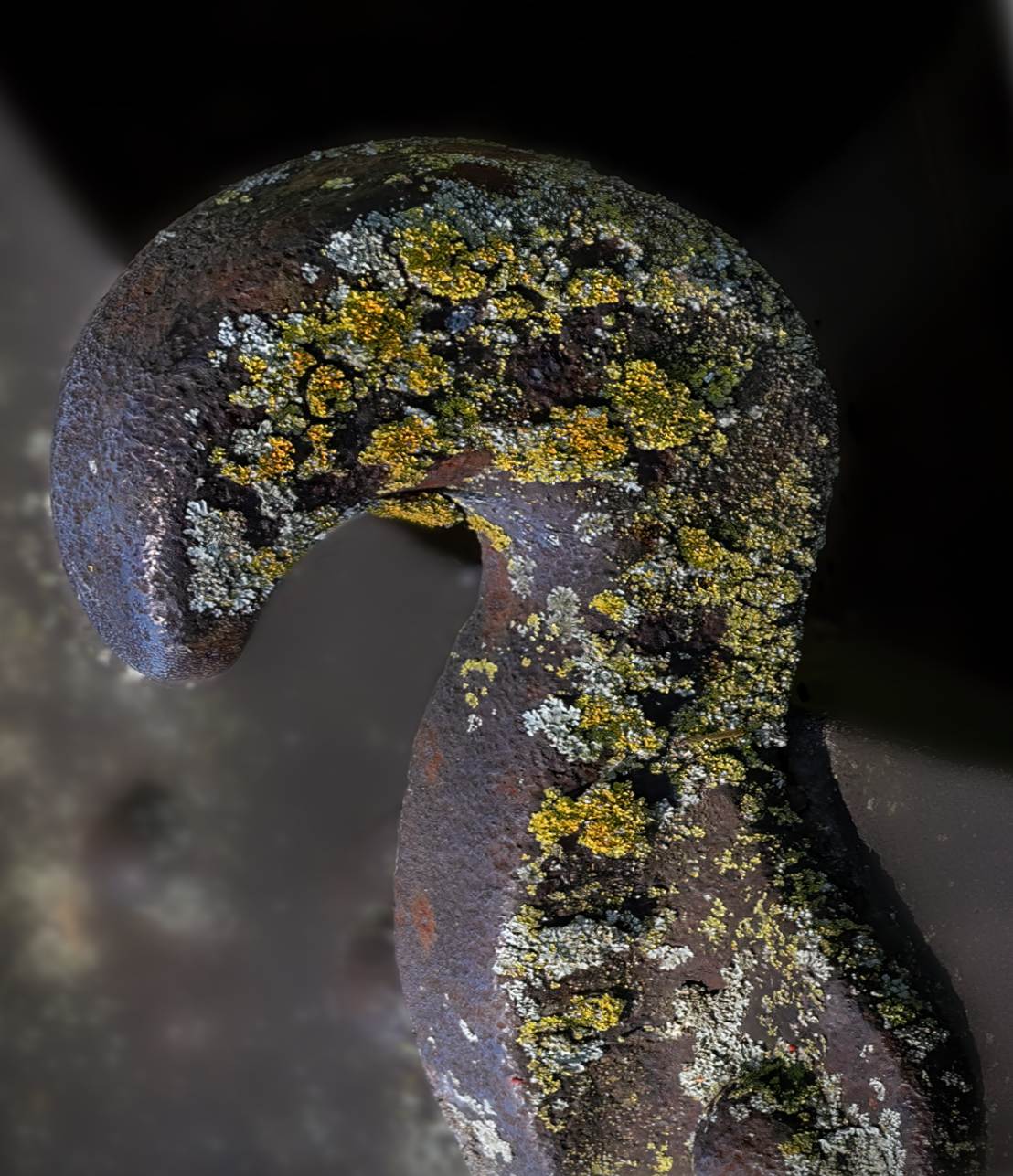 Rust always seem to initiate emotion in many viewers. Nice capture, I like the contrast between the rusty metal and the lichen/moss. I wondered what it would look like flipped over... so gave it a flip and a little boost in the hook vibrance. |