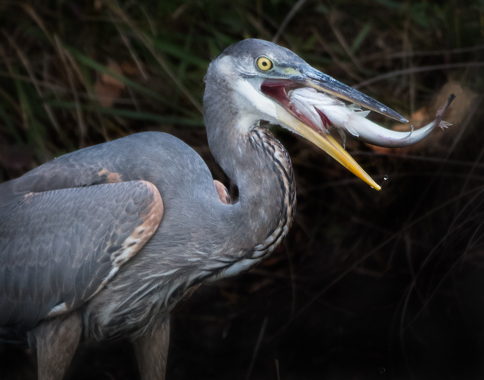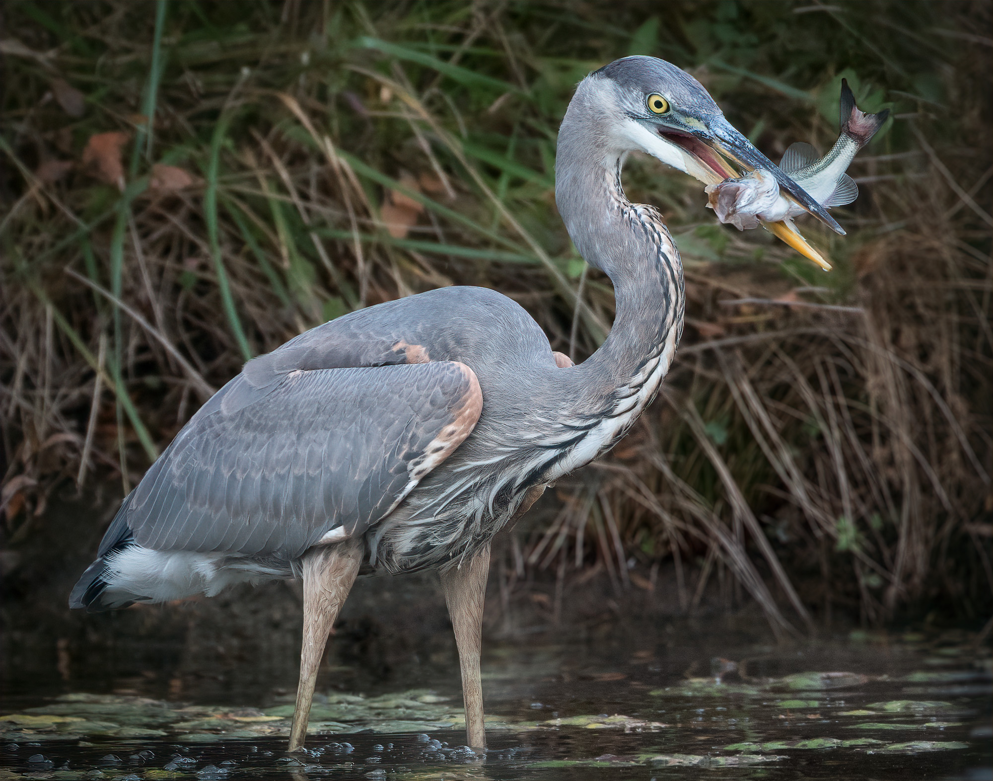 I was following her, walking on my knees along the opposite bank (hand held shot... I can't do that with a tri or mono pod. The ground is too soft and things get tangled in the mud, reeds and long grass). When I saw her lunch swim by, I started a high speed burst. One of the best features of the D500. When I reviewed my shots I saw that I had moved into high reeds. I'm glad I wasn't paying attention to that or I would have missed the shot. All I did was move a foot or two back to my left and took a clean shot of the opposite bank, giving me good cloning material. I covered the brown and light green leaves around the beak and fish tail with appropriate nearby material to separate them from the back ground. She flipped the fish in the air (between exposures)and swallowed it. I live just outside Washington, D.C. in Silver Spring MD. |