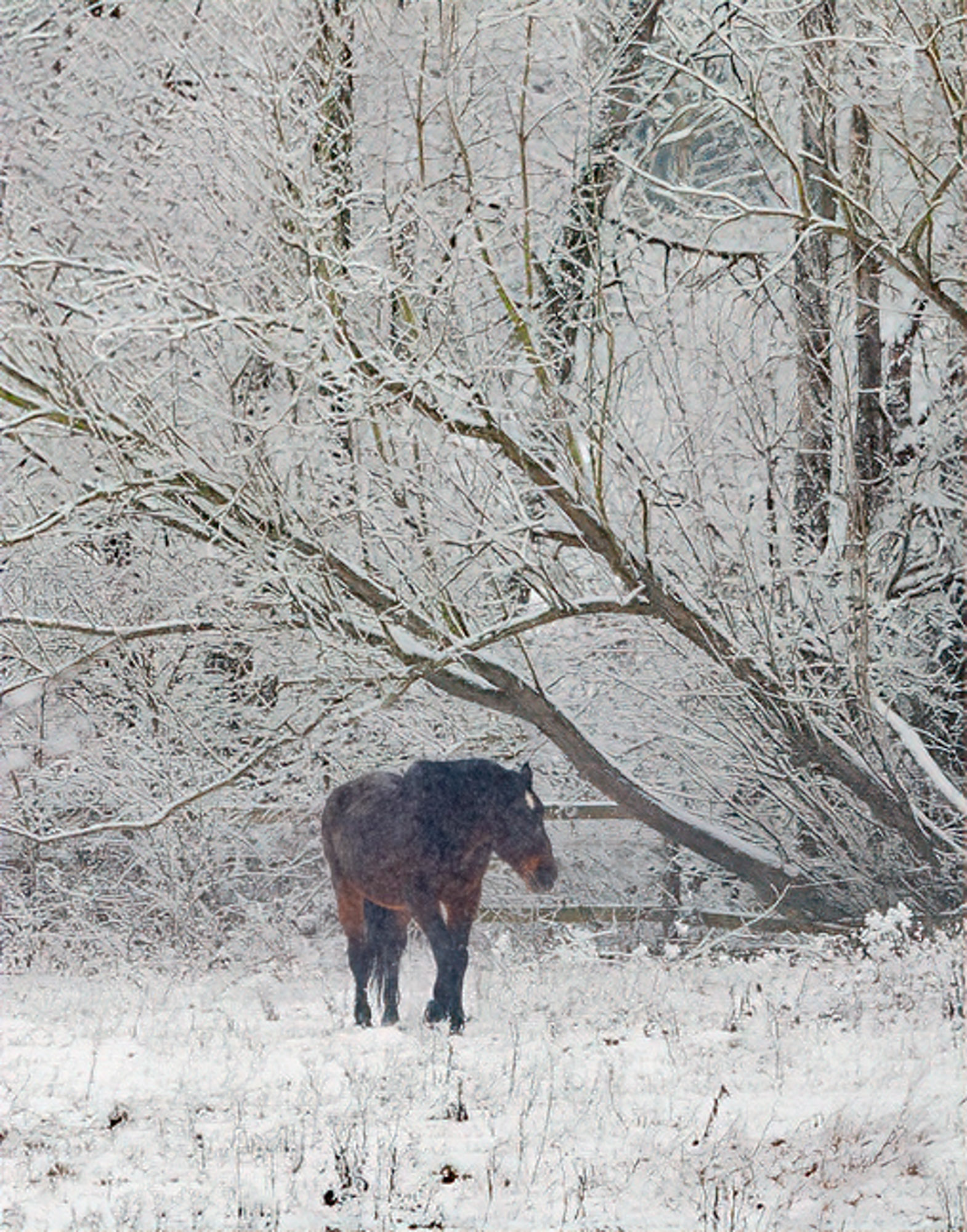 For me the bare branches are nothing to look at. It seems to me that if a photo needs to be explained it's not doing its job. What do you think of the vertical crop? I brought out the horse a bit and cleaned up the branches and fence railing. |