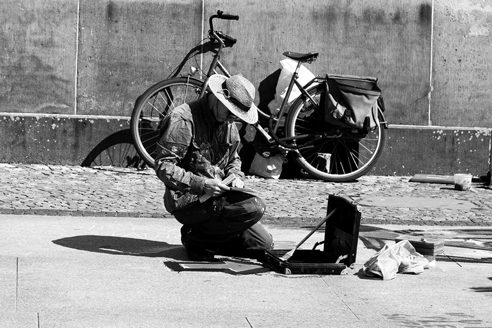 I like the candid view of this street artist at work. The B&W looks good, though I was surprised how colorful the art was when looking at the original.