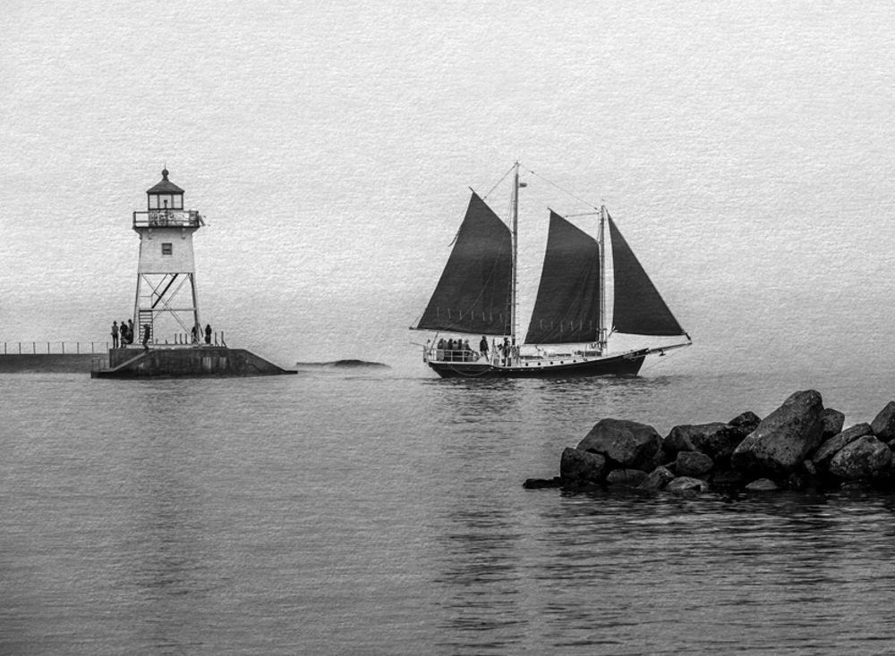 Very Nice shot. You have everything clean by that I mean there is water between the lighthouse, the schooner, and the rocks with contrast. I have two thoughts for you to consider, a crop to remove some of the sky and darkening the foreground to the horizon so there is tone separation.