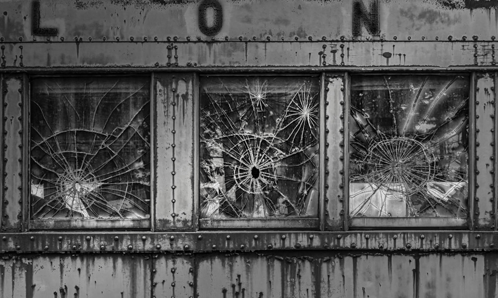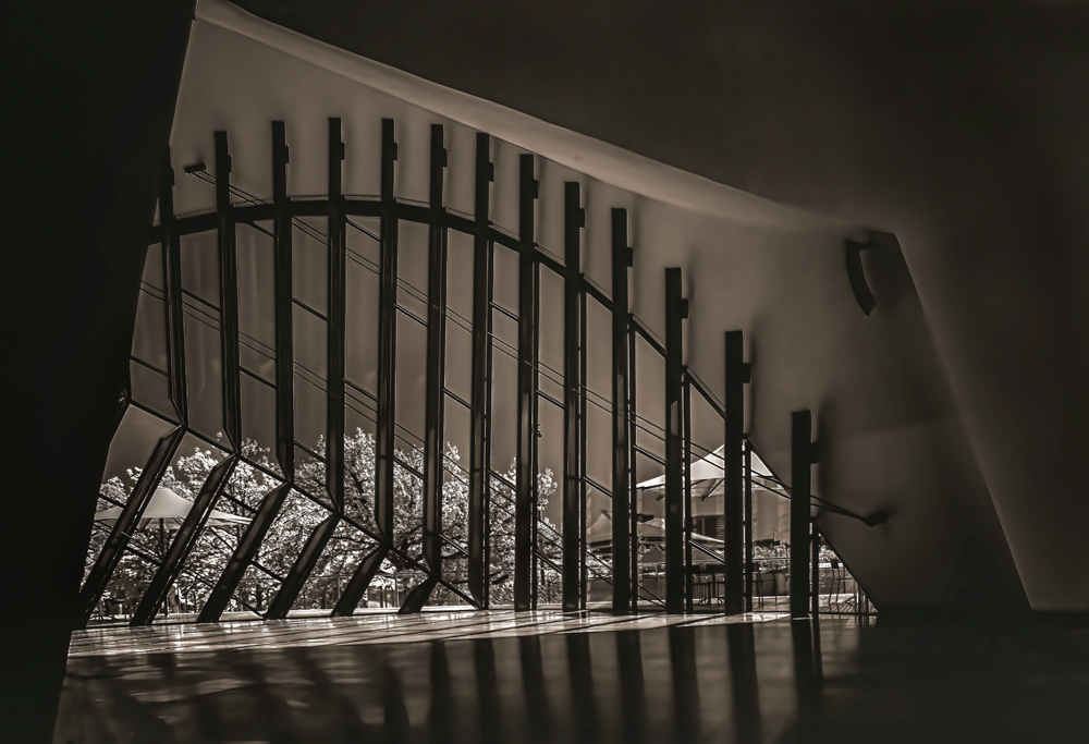 I cropped the image to three windows, used Nik's detail extractor preset on the windows, added a radial filter diagonally to simulate a light shaft, darkened the top left portion and the lower right somewhat.
