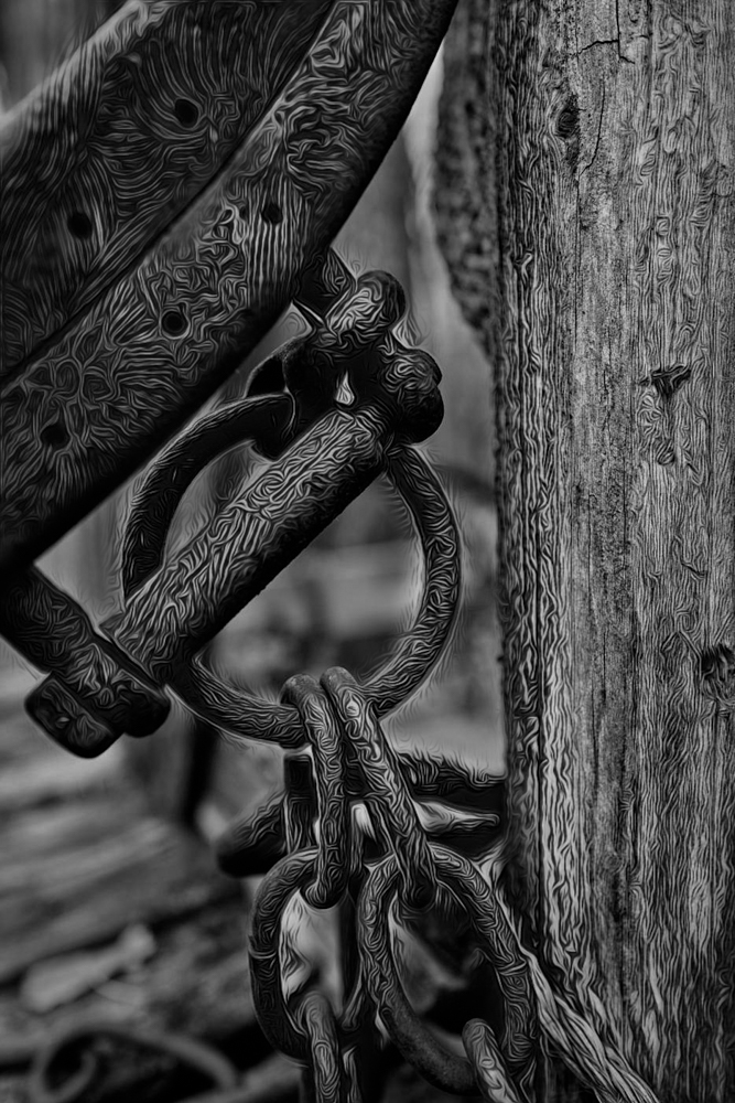 I loaded both images in PS CC with the Topaz 2 pattern on top of the color image. I rendered the color shot in BW, added a mask to the patterned image so only the chain and post were visible and reduced the layer opacity to 55%.