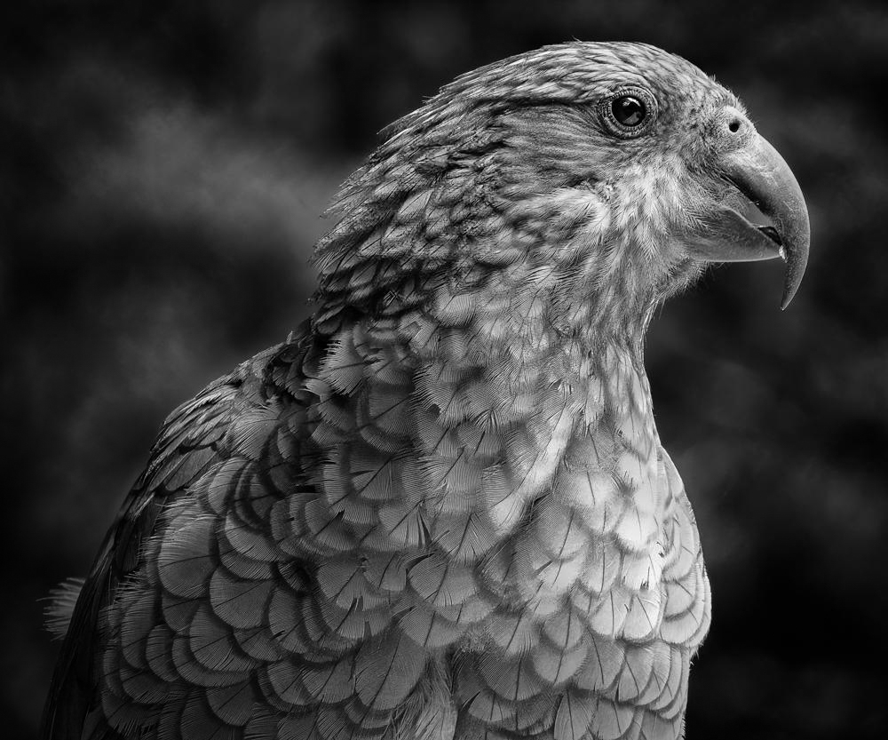 I did a couple of things in LR to your BW image: I used the brush on the Kea's head to lighten it, I darkened its chest some as LuAnn noted and finally I put a linear gradient drawn from the lower left corner and darkened the Kea's back.