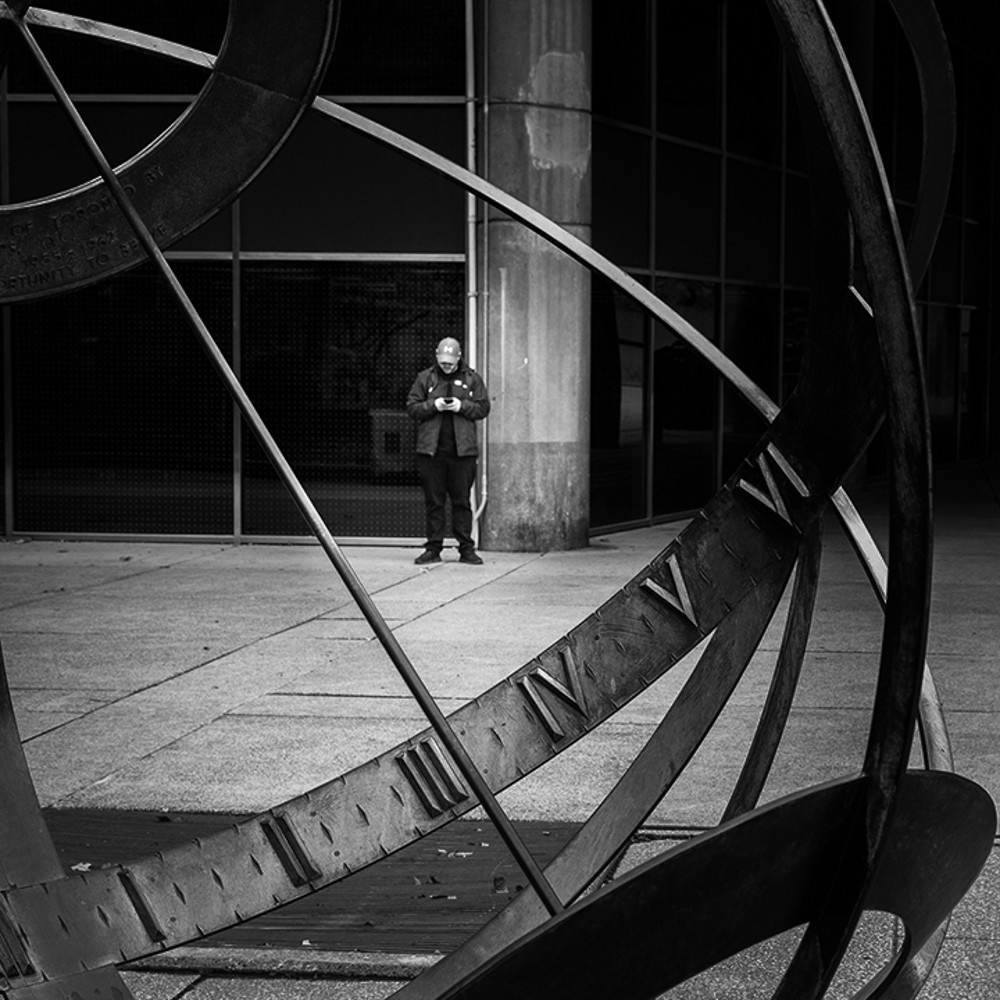 I like your concept but with the Sundial sharp and the your subject soft and darkly clothed, the eye goes first to the structure.