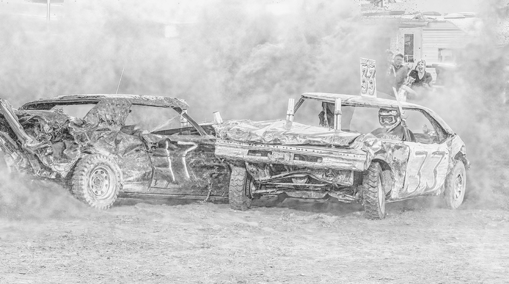 I started with your original, Used High 2 in Silver Efex, and the Detail Extractor in Color Efex to pull the details out of the dust cloud. The cars are a touch darker which offers contrast with the dust and the patch with the two spectators now has better context