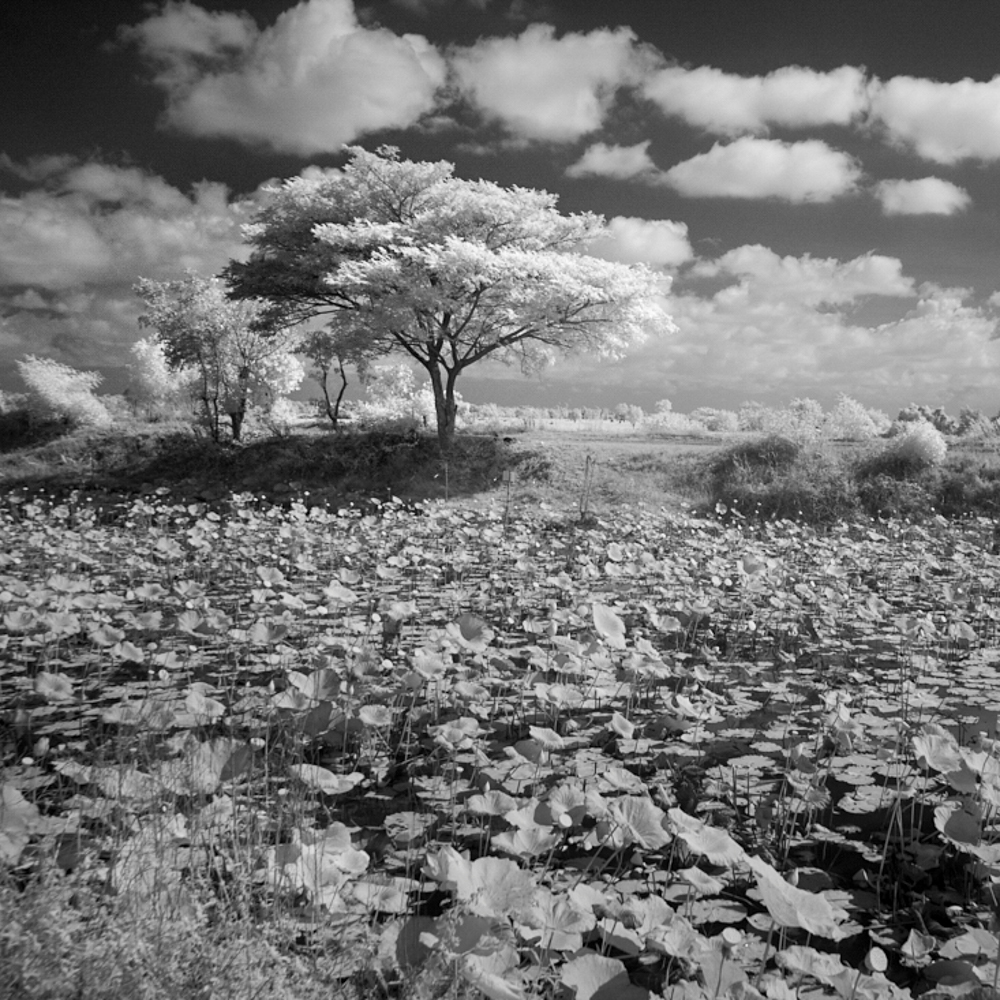 I think the nugget in your in your shot is the tall tree left side of frame. Wonderful IR texture. To that end I cropped your original square and moved it to the left. I wanted the lilies in the foreground as you shot them but reduced their exposure using a linear gradient. I put a radial gradient over the trees and increased the highlights, clarity etc.