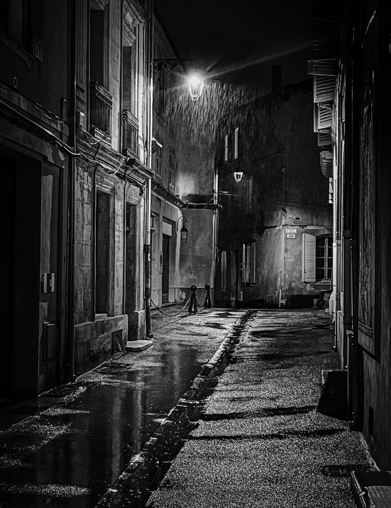 Food for thought. I dropped the overall exposure by 1/2 a stop to get the night mood going. I also dropped the highlights a bit - the light at the end of the alleyway is bit bright
