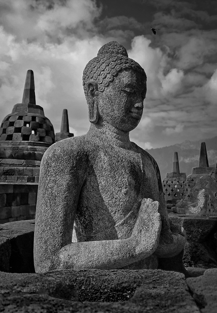 A couple of creative ideas: In Lightroom I selected the sky lowered the exposure and increased the whites, I added a linear gradient that was tilted along the shadows on the Buddha's face and shoulder on the upper right and lowered the exposure to enhance the shadow, I added another linear gradient that adjoined the first one and increased the exposure to enhance the sunlit surfaces. I added a vignette also