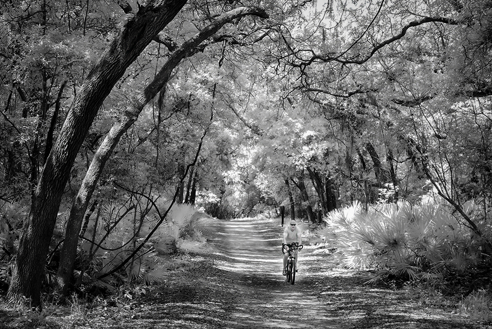 Perfect IR scene. Foliage, a path, and a model biking towards you You had a good day