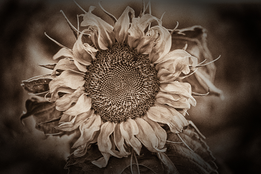 I love these big, happy fellows in colour, but I like what you have done in post...a completely different look...perhaps reflecting the remaining days of the bloom as well. I think I would have tidied up the extraneous leaves as I find them quite distracting, particularly at the bottom of the image....a vignette could possibly help and save a lot of post production time removing them. Perhaps just a little touch of contrast??? Had a little play, but it is quite a different look...perhaps I could have adjusted the opacity. Overall, a delightful image. |