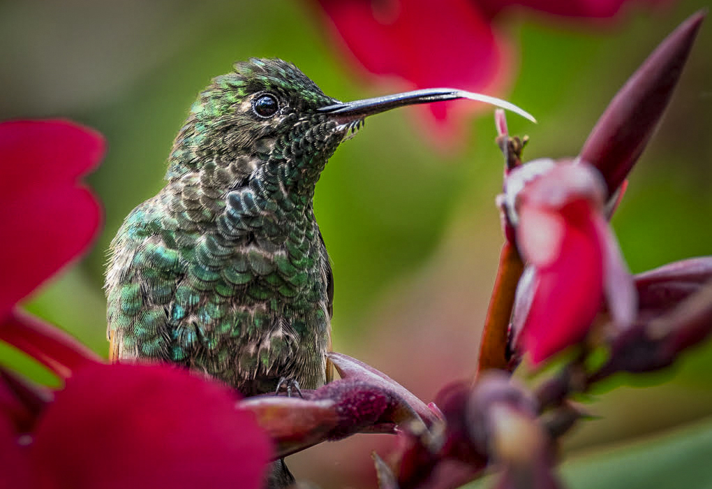 Adrian, I agree with the edits that Isaac made. The flower petals over powered the bird which is in sharp focus and with his tongue out no less! I tried some dodging on the flowers to reduce their brightness. I use NIK Viveza to help in that area as it does a wonderful job of just selecting the color you want to change. I also did some dodging on the green background to bring out the contrast of the hummingbird. |