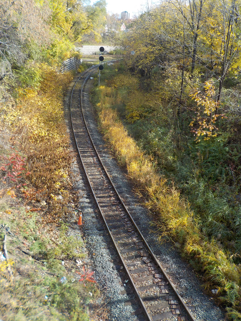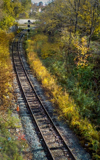 What catches the eye is definitely the curving railway. I like the idea, as it gives you a sense that the train is about to come into the frame from the bottom. I thought it needed to have the tracks emphasized so I played with it both in color and black and white. The color attached as I struggled with the B&W. Bumped up the Vibrance, cropped some off the left side, added a grad filter at top, brushed the tracks to have the blacks pop, whites upped and clarity added. |
